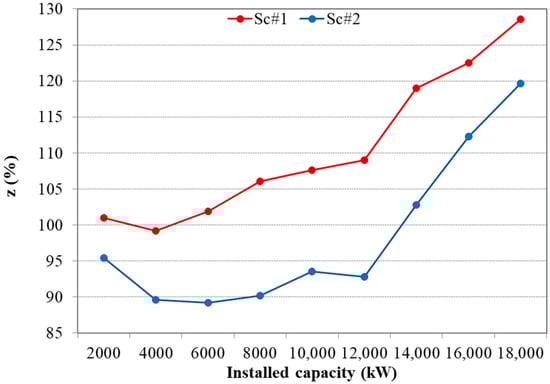 The z index as a function of PV installed capacity in both Sc#1 and Sc#2.