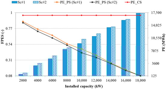 The values of FPES index near 100% is reached for the maximum PV capacity power in both scenarios since in this condition the amount of electricity imported from and exported to power grid in PS are very similar. This condition occurs for two reasons:
