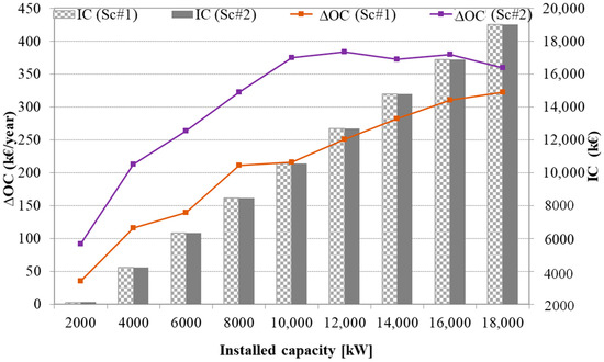 Economic analysis has been performed by calculating the investment cost (IC)for PS according to Equation (8) and the difference between operating cost of CS and PS (∆OC) as introduced in Equation (9) for both scenarios. Figure 7 reports ∆OC and IC trends as a function of PV power. Obviously, IC increases with PV installed capacity. Whereas, the difference between the IC in Sc#1 and Sc#2 is not appreciable since it mainly depends upon the cost of local microgrid connecting the agents. The Investment cost of local microgrid (ICLM) varies between two scenarios because of different length of IG nevertheless, this variation is not substantial compared to the investment cost of photovoltaic system (equal in both scenarios for a fixed PV power) which covers about 98–99% of total investment cost. ∆OC is higher in Sc#2 than Sc#1 and it reaches its maximum value (383 k€/year) at 12,000 kW PV installed power. ∆OC in Sc#1 is significantly lower since the amount of electricity imported/exported to/to grid varies between two scenarios and then its economic valorisation too.