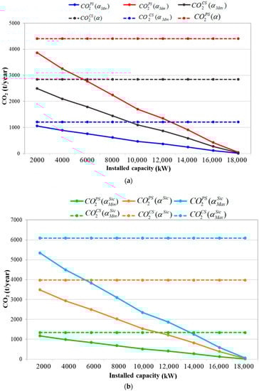 On the basis of these considerations, a sensitivity environmental analysis has been carried out with reference to Sc#2, considering the minimum, maximum and average emissions factor referred to Italy and Sicily zone. The outcomes of this analysis are showed in Figure 9a for Italy and in Figure 9b for Sicily zone, as a function of PV installed power. CO2 emissions of PS and CS have the same trends both for Italy and Sicily zone, but their values are very different. Indeed, if the CO2 emissions of PS are evaluated taking into account the minimum value of electricity emission factor for Italy () they vary from 1060 tCO2/year (for installed PV capacity of 2000 kW) to 11.89 tCO2 (for installed PV capacity of 18,000 kW). Vice versa, by considering CO2 emissions for PS rise ranging from 13.18 tCO2/year (for installed PV capacity of 18,000 kW) to 1176 tCO2/year (for installed PV capacity of 2000 kW). Obviously, CO2 emissions of CS calculated by means of , are lower than those one evaluated through too. In particular, amounts to 1207 tCO2/year while is equal to 1339 tCO2/year. Considering the worst cases referred to maximum values of emission factors, CO2 emissions grow both for Italy and Sicily zone either in CS and PS. With reference to installed PV power of 2000 kW, is equal to 3867 tCO2/year and amounts to 5344 tCO2/year, while and , that are constant for all installed PV capacities, rise until 4405 and 6088 tCO2/year, respectively. The avoided CO2 emissions index is positive for all considered emission factors, evidencing the environmental benefits of PS use instead of CS.