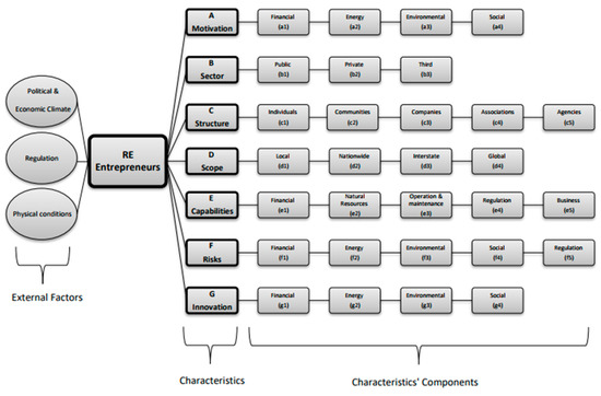 Unlike many other entrepreneurs in various fields (e.g., finance, real-estate development, etc.), the uniqueness of RE entrepreneurs lies in the broad heterogeneity of their characteristics, as discussed in the following section. For example, RE entrepreneurs are not motivated just by financial incentives but possibly also by energy-utilization, environmental, and social incentives [29]. Another example relates to the fact that RE entrepreneurs are not an exclusively private sector phenomenon, as public sector and third sector entrepreneurs, such as state-owned enterprises and cooperatives, can also be important RE entrepreneurs [30]. Hence, despite commonalities in their promotion of RE, RE entrepreneurs should not be regarded as a homogenous group. Rather, they are defined by the characteristics that distinguish them from one another, classified as external influential factors, motivations, functional features, risks, and innovations. These various characteristics of RE entrepreneurs have been separately discussed in several studies (e.g., [20,21,22]), but for the first time, they have been systematically synchronized into one coherent and unified conceptual framework, which is based on an extensive literature review.