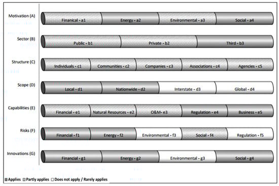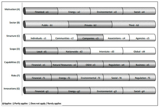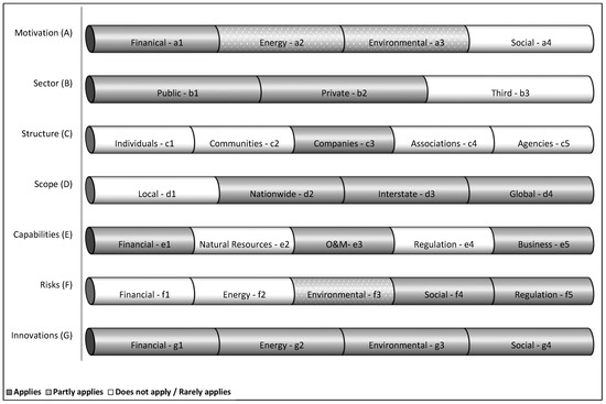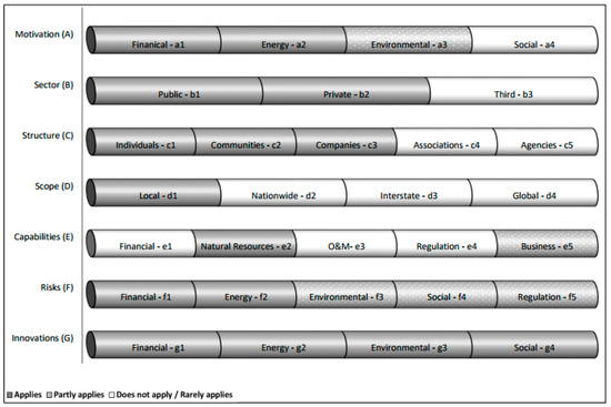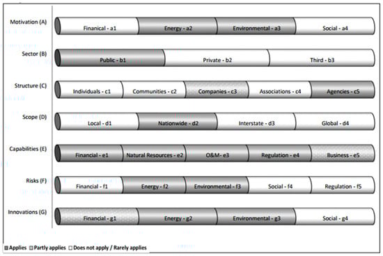 Figure 2 depicts an example of a hypothetical RE entrepreneur. The different rows in the figure represent the entrepreneur’s characteristics, divided into their various possible components. Different background textures are used to represent the status of the characteristics’ components: if a certain component completely applies to the entrepreneur then it is presented with a smooth grey background; if the component only partly applies, it is presented using a dotted background; and if the component does not apply or rarely applies then it is presented with a white background. As can be seen, this hypothetical profile represents an entrepreneur who is strongly motivated by financial reasons (a1), while its energy (a2), environmental (a3), and social (a4) motivations are of lower prioritization. Being perhaps part of a partnership, this private sector (b2) entrepreneur also has limited connections with the public (b1) and third (b3) sectors. This entrepreneur is organized in a corporate structure (c3) whose activities are mostly in the local regional scope (d1) with some being nationwide (d2). The entrepreneur has an equal mix of the different significant capabilities, including financial (e1), natural resources accessibility (e2), operation and maintenance experience (e3), regulation knowledge (e4), and business skills (e5). In the project illustrated in this example, the entrepreneur faces, primarily, financial risks (f1), followed by energy production risks (f2), and much lower environmental (f3), social (f4), and regulation (f5) risks. Finally, this entrepreneur mobilizes more financial (g1) and energy-utilization (g2) innovations to promote RE facilities but also uses some environmental (g3) and social (g4) innovation mechanisms.