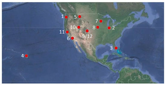 Data collected from 12 locations were utilized within this study—the data is available for further analysis []. The collection locations were selected from a larger dataset of all Department of Defense (DoD) installations located within 25 regions []. Using this dataset, along with a recognized climate classification matrix, a Pareto analysis was performed to determine the locations of test sites within climate regions []. While reviewing the collected data, the project team discovered that only a subset of locations collected reliable data. After post-processing the data, the team chose to limit collection data to the northern hemisphere. This decision was motivated by seasonal differences between hemispheres and selecting collection sites in close proximity to National Oceanic and Atmospheric Administration (NOAA) weather stations.