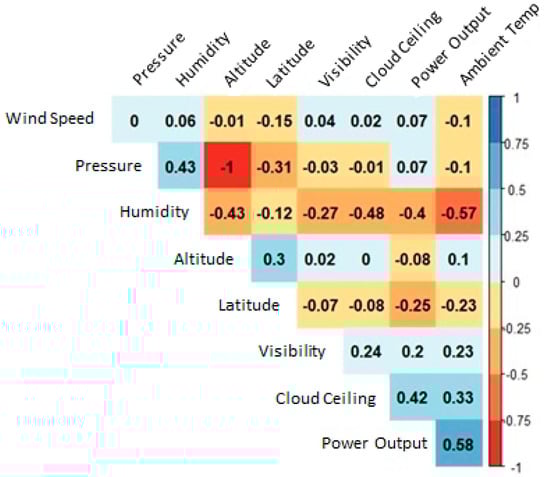 The initial dataset was filtered to only include the time window of 10:00–15:45 to avoid modeling periods of darkness and reduced sunlight. This restriction also helped mitigate possible obstructions from both natural and man-made objects when the sun was low in the sky. Next, the pairwise correlation coefficients for all numeric variables across all sites were calculated—the results are presented in Figure 2. Only one pair of variables showed a high correlation coefficient: altitude and pressure. Altitude was subsequently removed since its value did not change with location, whereas pressure did have some degree variation for a location—i.e., power output.