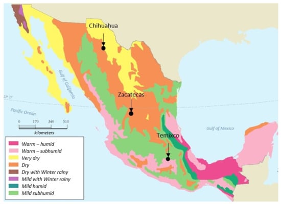 Data from three sites were analyzed, and at each site, there was an available weather station with specific characteristics. The studied sites were chosen based on their solar radiation potential, weather characteristics, and data availability. These meteorological stations were located in different cities of Mexico, namely: Chihuahua, Temixco, and Zacatecas. Figure 1 shows an approximate climate map of Mexico. This figure also shows the locations of the studied sites. Furthermore, Table 1 shows the precise location of the sites and their corresponding weather type. The main characteristics of measurement equipment of the meteorological stations are shown in Table 2.