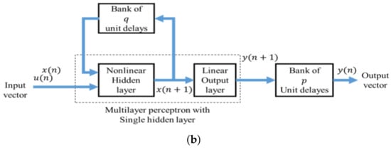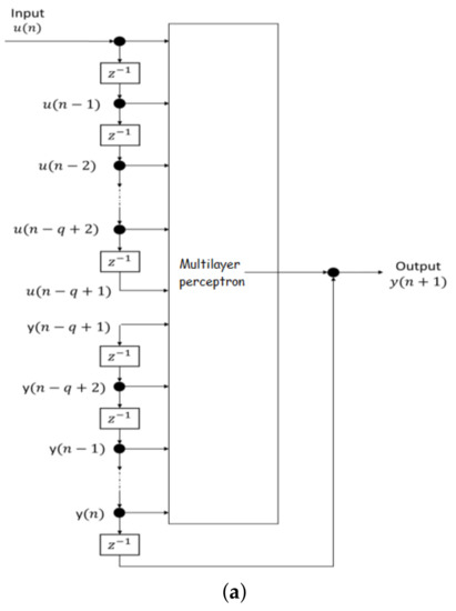 Expressed in words, some non-linear mapping exists whereby the present value of the output is uniquely defined in terms of its past values and the present and past values of the input . For this input-output representation to be equivalent to the state-space model of Equations (4) and (5), the recurrent network must be observable. The practical representation of this equivalence is that the NARX model (see Figure 2a, with its limited feedback towards the output neuron, is in fact able to simulate the corresponding fully recurrent state-space model of Figure 2b (assuming that and ), with no difference between their input-output behavior [26].