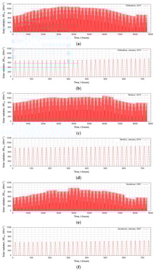 Solar radiation under clear sky conditions (): (a) Chihuahua: 1 January to 31 December 2015; (b) Chihuahua: 1–31 January 2015; (c) Temixco: 1 January to 31 December 2014; (d) Temixco: 1–31 January 2014; (e) Zacatecas: 1 January to 31 December 2007; and (f) Zacatecas: 1–31 January 2007.
