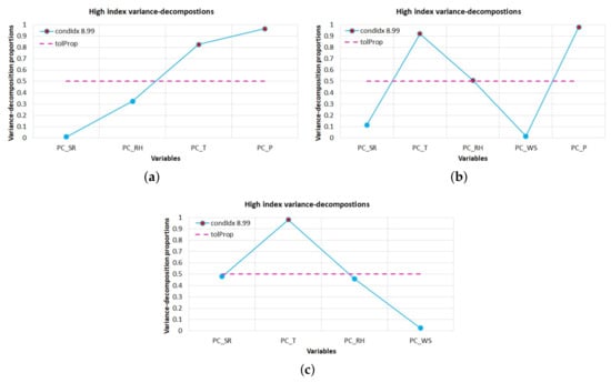 Results of the collinearity tests: (a) Chihuahua, (b) Temixco, and (c) Zacatecas.