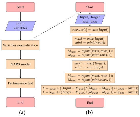 Nonlinear autoregressive exogenous model: (a) Main flow chart. (b) Variables’ normalization subprocess.