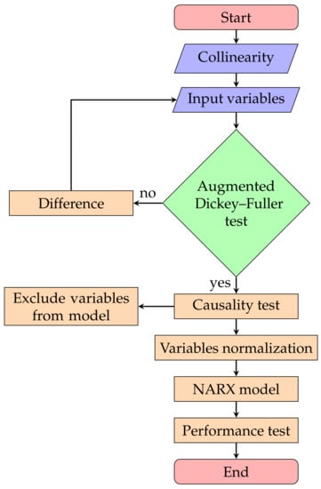 It should be noted that, since three study cases were a limited sample to have a conclusive result, the input vectors obtained with the procedure described in this work for other cases could not be SR and T. Thus, the results obtained in this work, concerning the delimitation of the input variables of the NARX models, did not represent a general rule. Furthermore, another determining factor in the conformation of the input vector, other than collinearity and causality tests, was the historical data, on which the training of the forecasting model depended.