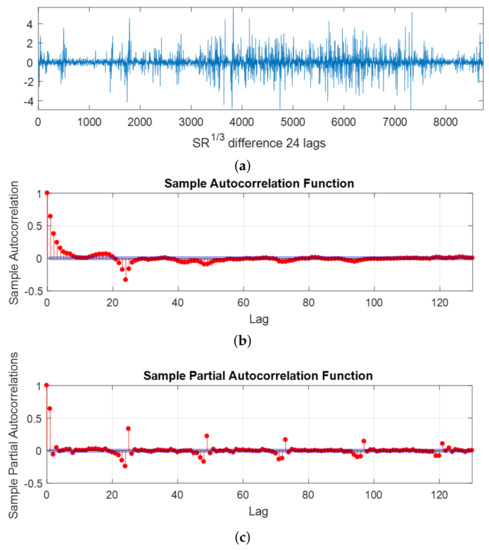 First, the variance and the mean were stabilized through the cubic root of the solar radiation, i.e., . Then, it was differentiated using 24 lags, as . Figure 7a shows the transformation of the solar radiation time-series resulting from the application of these operations. After that, the autocorrelation function (ACF) and the partial autocorrelation function (PACF) were obtained from the stabilized solar radiation time-series. Figure 7b shows the sinusoidal behavior of the ACF, which was a clear sign of the presence of seasonality in the SR times-series. At the same time, the PACF displayed peaks every 24 h, which indicated that the time-series presented daily evolution; see Figure 7c. Therefore, the NARX models were tested with different numbers of time lags until reaching 24 lags. The results showed that the best predictions were obtained when 24 lags were used.