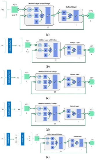 Similarly to the Chihuahua case, the NARX model that included all meteorological variables available in the site as inputs is presented in Figure 8a, where . According to the collinearity tests, the temperature, the relative humidity, and the pressure showed collinearity. Consequently, these variables could not be combined to build the input vectors. Figure 8b–d shows how the input vectors were generated using the collinearity tests, namely , , and , respectively. Finally, in Figure 8e, the solar radiation and temperature were considered as input variables to the NARX model. This vector was obtained from the application in the collinearity and causality tests. As can be seen, the results of the collinearity and the causality tests were not included for the cases and ; this was because, when applying the causality test to these cases, the results did not suggested any change. Nevertheless, the only change observed occurred when the causality test was applied to ; where, according to the causality test, WS did not cause SR. Therefore, in this particular case, the input vector was composed as .