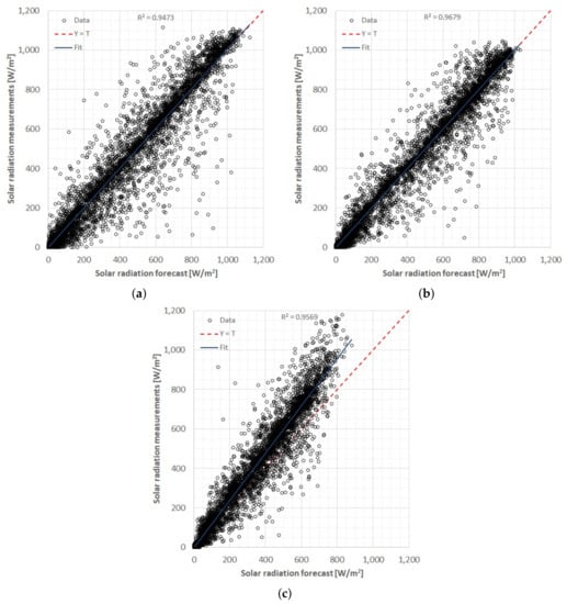 Linear regression analysis was applied to better visualize forecast accuracy. The results of this analysis are shown in Figure 9, where the x-axis represents the solar radiation forecasting, the y-axis represents the real data, and the blue line is the regression line. This figure shows that the correlation between the real and the predicted data was between and , which indicated that the models were very competitive.