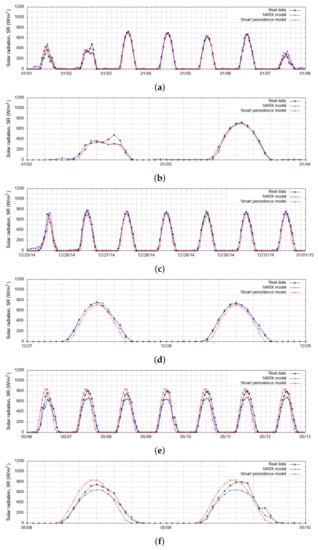 Figure 10c shows the comparison between real and prediction data for 6 May 2007, to 12 May 2007, for the city of Zacatecas. In this case, the RMSE of the NARX model was 7.02 W/m, while 10.16 W/m for the smart persistence model. The measured data had an irregular behavior, which caused the NARX model to underestimate the values of SR. In contrast, the smart persistence model overestimated it. Consequently, once again, it was necessary to know the measurement of the prediction error to determine which was the best fit.