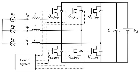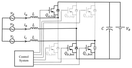 Utilizing bidirectional power converters for charging and discharging of the PEV’s battery with the ultimate goal of achieving higher efficiency, improved power quality, higher power density, lower THD, reduced switching losses, less number of components, and cost-effective operation has widely been presented in the literature [7,8,9,10,11,12,13,14,15,16]. Different battery charger topologies and required infrastructures for PEV chargers have been reviewed in [17,18,19]. All of the proposed PEV battery charging systems can be broadly categorized in on-board and off-board chargers. Although, on-board chargers can be used anywhere due to their integration within the vehicle, they have some limitations in power range, weight, size, space, and the cost. Off-board chargers, on the other hand, offer higher power range in three levels (levels 1, 2, and 3) with less constraints of size and weight. Level 1 charging, also known as slow charging, can be done by plugging the electric vehicle to a convenience outlet of a private facility, while level 2 charging is utilized as the primary charging method for both private and public facilities. Both level 1 and level 2 chargers are usually implemented using single-phase unidirectional/bidirectional power electronic converters. However, the power level of integrated single-phase chargers is limited [20]. Three-phase battery charges, on the other hand, can operate at higher power levels and can fully charge EV battery packs in shorter time. Therefore, three-phase converters are utilized to implement level 3 chargers, also known as fast chargers, which are normally considered in public and commercial facilities. Three-phase chargers are bulkier and more expensive compared to single-phase chargers. However, the size and weight of three-phase high-power chargers can be significantly reduced by simplifying it to only a three-phase power electronics interface as a three-phase integrated charger [21,22].
