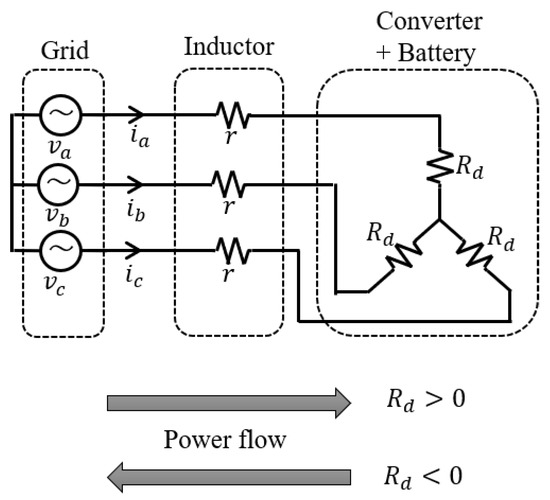 In this section, we present the proposed nonlinear sliding-mode control strategy, which is applied to the bidirectional three-phase single-stage converter, whose dynamic model was derived earlier in Section 2, as a PEV battery charger to facilitate both charging and discharging scenarios. The proposed nonlinear sliding-mode controller keeps the input voltage and current of each phase in the same phase in a way that the converter together with the battery could be seen as a three-phase resistive load. Therefore, the proposed controller sets and maintains a positive or negative desired resistance in real-time at the input terminals of the converter. Although the value of the desired resistance is calculated based on the circuit’s components, the sign of desired resistance specifies the direction of power flow either from grid to the battery (G2V) in charging mode when or from the PEV’s battery to the utility grid (V2G) in discharging mode when as illustrated in Figure 3. Regulating and control of desired pseudo-resistance between the input voltage and current of each phase will result in lower harmonics and higher power factor.