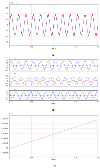 Figure 5 and Figure 6 show the simulation results with the desired input resistance of and , respectively. It is evident from these figures that when the desired input resistance is positive, the power is transferred from the grid into the battery with unity power factor facilitating G2V mode of operation, in which PEV battery is charged. Similarly, for the negative input resistance of , the power is transferred from the PEV battery into the grid facilitating V2G or discharging mode of operation. Moreover, the battery’s state-of-charge (SOC) illustrated in Figure 5c and Figure 6c confirm charging and discharging functionality of the proposed system.