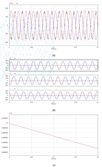 Simulation results for Rd = −10 Ω. (a) The voltage of Phase-a and its current multiplied by Rd. (b) The input voltage and current of each phase. (c) The battery SOC.