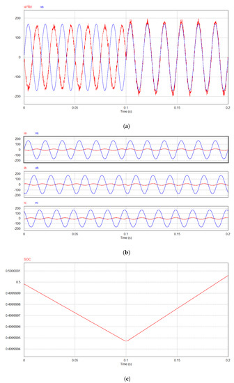 Simulation results for a sudden change in the mode of operation from discharging when Rd = −10 Ω to charging mode when Rd = 10 Ω. (a) The voltage of Phase-a and its current multiplied by Rd. (b) The input voltage and current of each phase. (c) The battery SOC.