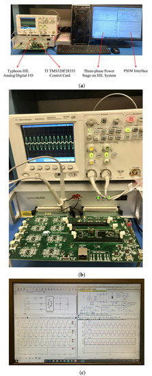 Experimental Set-up: (a) Set-up overview. (b) TI TMS320F28335 control card and oscilloscope showing input voltage and current of phase-a with step change in desired resistance from −10 Ω to 10 Ω. (c) PSIM interface and implemented power stage on the hardware-in-the-loop (HIL) system.