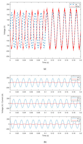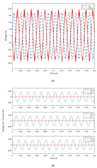 Experimental results for Rd = −10 Ω. (a) The voltage of Phase-a and its current multiplied by Rd. (b) The input voltage and current of each phase.
