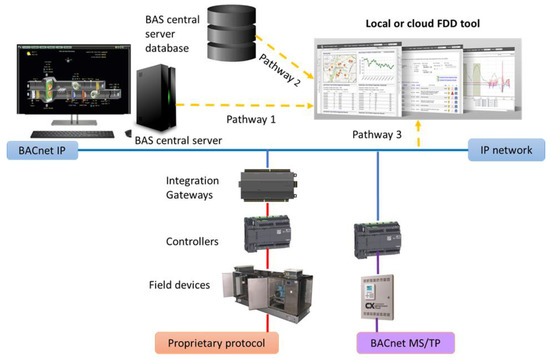11]. Field devices (and controllers) connect to the sensors and actuators in the field. Network controllers typically provide supervisory control capabilities, scheduling, alarms, trending, local data storage, and user interfaces, in addition to some security features. Modern versions of these controllers have the ability to communicate via a BACnet (a data communication protocol for building automation and control network) IP over an IP network. When such functionality is not available, a common integration strategy employs “integration gateways” (e.g., Niagara JACE) that translate from proprietary protocols to standard protocols, such as BACnet IP. For larger installations and campuses, the controllers or gateways are also connected to a BAS server that provides configuration and management, long-term data storage (i.e., databases) and visualization tools. FDD tools can be installed in the local IP network, run from the cloud, or have a combination of cloud and local components. Integration with the BAS is typically implemented through a one-way interface using one of these three FDD–BAS integration pathways: