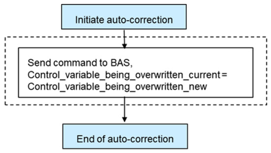 15], the control_variable_being_overwritten in the auto-correction algorithm is Manual_Override. This variable indicates the equipment (e.g., fan speed, valve control command, damper control command) manual control status or equivalent flag: 1—equipment is in manual control, 0—equipment is in automatic control. When there is the override fault, Manual_Override = 1 in the faulty case. The correction algorithm changes the manual control variable back to automatic (Manual_Override = 0).