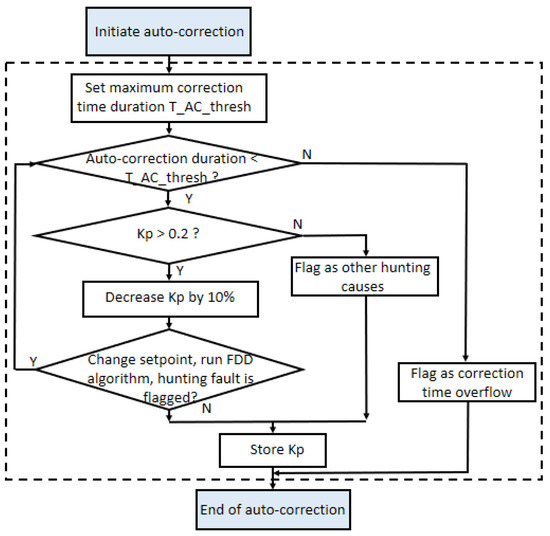15]. The control_variable_being_overwritten is the proportional–integral–derivative (PID) controller parameter proportion gain (Kp). In the auto-correction process, the Kp is continually adjusted to find out the appropriate value that eliminates the hunting behavior. When the FDD algorithm flags an improper Kp causing the hunting fault, the auto-correction algorithm is initiated. First, a maximum auto-correction duration threshold (T_AC_thresh) is set to avoid an endless auto-correction process. Note that a setting time of an actuator during the control response may be varied due to different actuator control characteristics. For example, for a VAV terminal unit damper, the settling time is typically in the order of one or two minutes, but the settling time for a cooling coil valve may be several minutes. Then, the current value of the Kp is compared to a Kp_threshold, in this case 0.2. This test is meant to avoid an unacceptably long settling time under pure integral control. If the Kp value is above the Kp_threshold, the Kp is decreased by 10% [