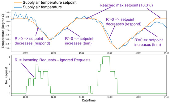 R’ was larger than zero starting at 10:05 a.m., the algorithm slowly reduced the SAT setpoint by 0.06 °C for each request every five minutes. Starting at 11:50 a.m., the