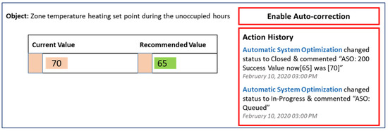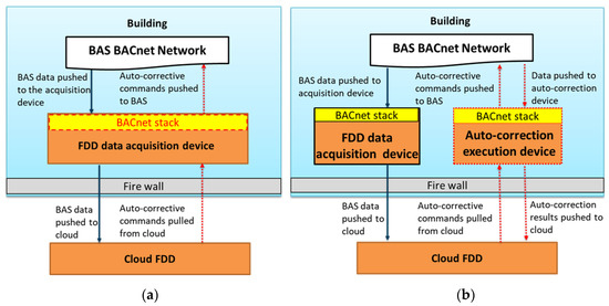 Figure 9b), the current BACnet library already had writing capabilities. To enable secure communication with the cloud, the system architecture was changed. The standard data acquisition device was paired with a new field device (an auto-correction execution device) specifically designed to execute the new routines and log the interaction with the BAS. The cloud FDD engine initiated the auto-corrective command onto the auto-correction execution device. The device then executed the commands onto the BAS BACnet network and reported back the results to the cloud FDD engine. The BAS data were still acquired by the existing FDD data acquisition field device and delivered to the cloud FDD engine. The third on-premise FDD system was already capable of writing commands via BACnet. It only needed to change a setting in the BAS to authorize the changes.