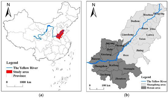 Map showing the study area, Henan and Shandong Provinces, and the Yellow River. (a) Location of the study area with China, (b) map of Henan and Shandong Provinces.