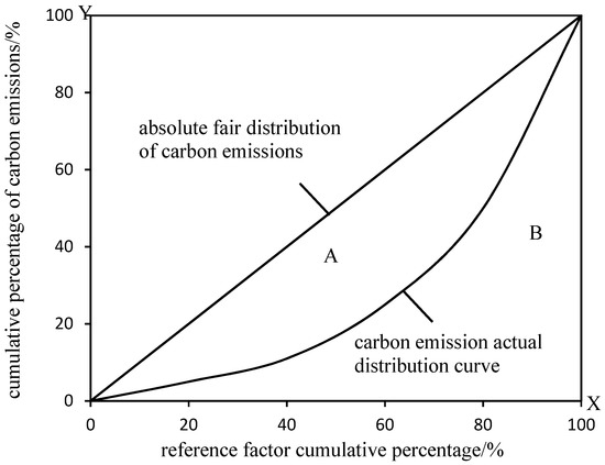 According to the Lorenz curve, the Gini coefficient is put forward by the Italian economist Gini, which is widely used as a comprehensive index to investigate the difference of income distribution among residents [54,55]. In this paper, the Gini coefficient and carbon emission characteristics are combined, and the carbon emission equity evaluation model is cited [56] (Figure 2).
