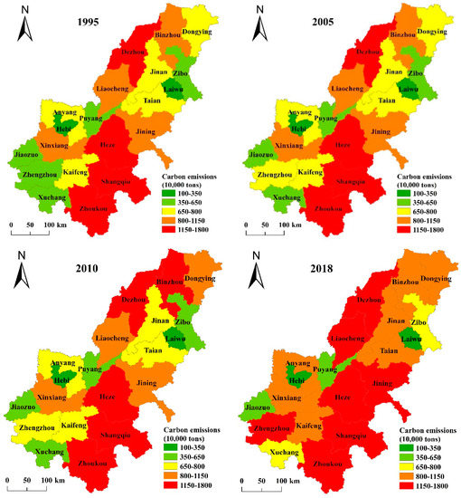 With continuous economic development, carbon emissions increased. For instance, in 1995, four cities (Dezhou, Heze, Shangqiu, and Zhoukou) had very high carbon emissions (11.5 million tons), however, seven cities (Dezhou, Liaocheng, Jining, Heze, Shangqiu, Zhoukou, and Zhengzhou) had very high emissions in 2018. Moreover, the only cities with carbon emissions below 3.5 million tons were Laiwu and Hebi. With the continuous development of the economy, carbon emissions in all regions are increasing. The number of cities with carbon emissions between 800 and 11.5 million tons has increased from four in 1995 to seven in 2018. Among the cities, Zhengzhou’s carbon emissions increased the most from 1995 to 2018, along with an increase in GDP of 975.34 billion yuan, from 38.99 billion yuan to 1014.33 billion yuan. This showed that carbon emissions increased along with economic development, and that Zhengzhou had not achieved sustainable economic development and environmental protection. By contrast, in all study years, only Laiwu and Hebi had very low carbon emissions.