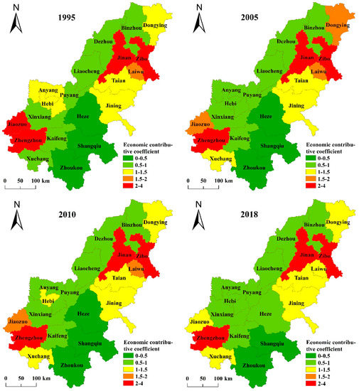 Spatial distribution of the carbon emissions economic contributive coefficient in prefecture-level cities of the lower Yellow River area from 1995 to 2018.