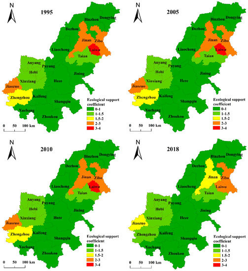 Spatial distribution of ecological support coefficients in prefecture-level cities of the lower Yellow River area from 1995 to 2018.