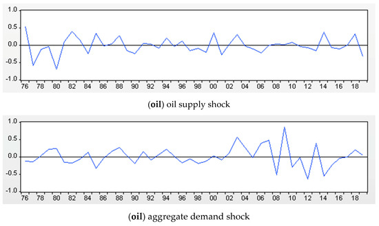 Figure 1, Figure 2, Figure 3 and Figure 4 summarize the empirical results of the SVAR model based on Equations (1)–(4) from Section 2. After obtaining the model estimates, we can calculate the structural residuals.
