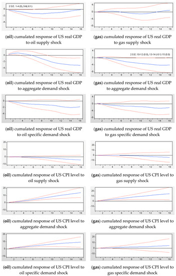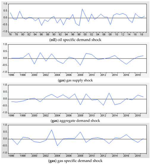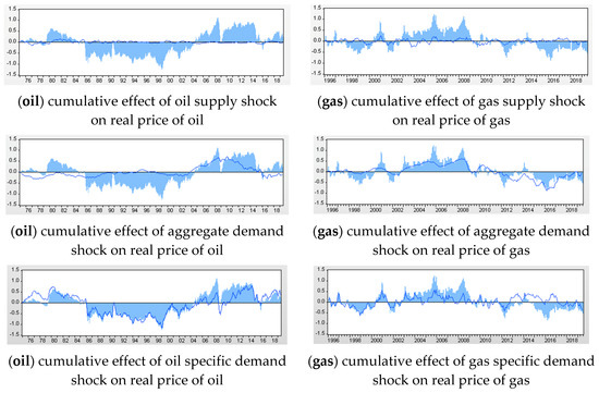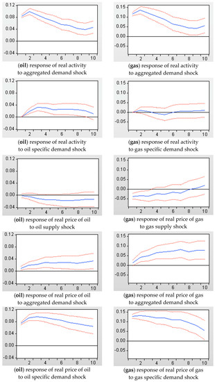 Therefore, in our future research, first, we plan to identify a more appropriate index to reflect overall global economic activity, and compare the results with those based on the Kilian Index. Second, as noted in Section 3.1.3, the cumulative contribution of an oil-specific demand shock to real prices is larger than the cumulative contribution of a gas-specific demand shock. Thus, we intend to identify the underlying determinants or causes of this issue. Third, in order to effectively apply our results to the policy-making process and inform appropriate monetary policy, we propose to extend the results by a machine learning approach to forecast price fluctuations corresponding to various kinds of uncertainty conditions, namely financial crises, wars, emergencies, disasters, etc. Fourth, the approach of Kilian [6], followed herein, did not include analysis of cointegration; thus, we plan to expand the analysis within the framework of cointegration. Finally, assessing the effects of oil/gas price shocks on other major countries’ macroeconomic aggregates is also worthy of extending the current investigation in future research.
