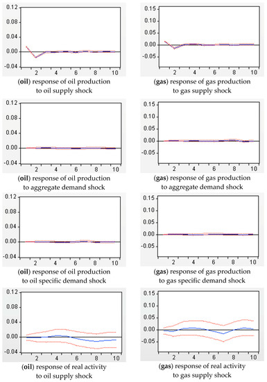 The similarities and differences between our empirical results and those of Kilian [6] can be summarized as follows. Firstly, comparing the results which showed the responses of global oil/gas production, real economic activity, and the real price of oil/gas to structural innovation reveal that they are alike with minor differences. The major distinction is the different effects on real economic activity that result from precautionary demand shocks to crude oil versus natural gas. Another point is that the statistically significant lasting period of influence from oil-specific demand shocks on global economic activity were shorter than they were prior to 2009, as the results from Kilian [6] showed. Secondly, comparing the results of the historical decomposition of real prices, our results for crude oil are approximately similar to Kilian, but one concern is that, during the period 1985–2000, Kilian’s study showed a negative cumulative effect of an aggregate demand shock on the real price of crude oil, while the effect in our study was extremely close to zero [6]. Thirdly, comparing the result of effects of respective shocks on the US macroeconomy, the empirical results are very similar with minor differences. The results of oil supply shocks on GDP showed that the two standard error bands were statistically significant for only half a year, compared to the two years reported in Kilian [6], which was explained by the one standard error band. Because of the different adoption of the standard error band, unanticipated oil-specific demand shocks led to a statistically insignificant reduction in US real GDP for all observed time horizons, whereas Kilian’s results implied statistical significance in the 3rd year [6].