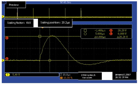 According to “IEC62305-1 Lightning Protection Part 1: General Provisions”, lightning with an average of three to four lightning strikes and a lightning strike interval of approximately 50 ms is defined as multi-pulse. This experiment waveform therefore used multi-pulse current as the number of pulses was five and the pulse interval was 50 ms, the pulse amplitude was the nominal discharge current of the ZnO varistor, and the waveform on the oscilloscope is shown in Figure 2. In the Figure, the five yellow vertical lines zooming in and out represent five pulses, respectively, and the 8/20 μs waveform below is a full waveform diagram of a single pulse.
