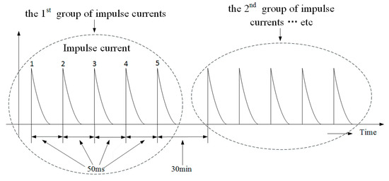 - Impulse test: use multi-pulse current to perform an impulse test on the ZnO varistor. The impulse test process is shown in Figure 3. Every five pulse currents were recorded as a group and a test was performed. Each adjacent two impact groups had time intervals of 30 min, as this time interval was enough to allow the ZnO varistor to cool to room temperature and then perform the next test until the ZnO varistor static parameter varistor voltage change exceeded the original ±10%, or the leakage current exceeded 20 μA or the mechanical damage occurred directly. When the ZnO varistor failed, the impulse test was stopped and the relevant data was recorded.