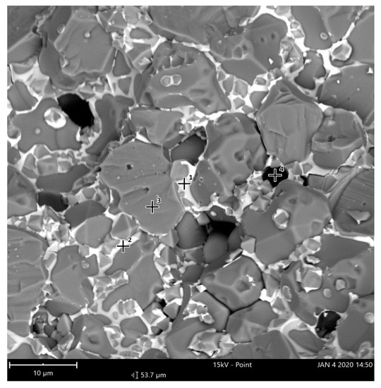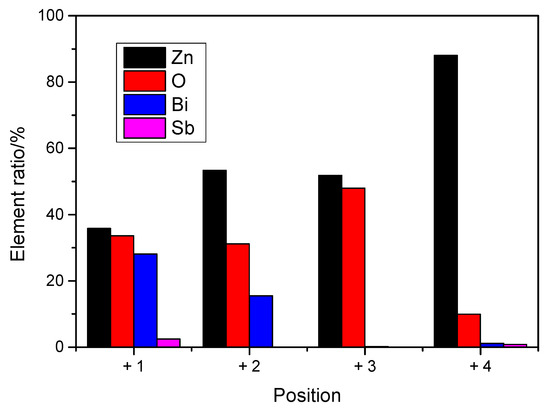 The white bright area at the +1 position was the grain boundary layer. The EDS spectrum analysis is shown in Figure 6. Four elements were detected in this area, namely Zn, O, Bi and Sb, of which Zn accounted for 7.47%, O accounted for 60.75%, Bi accounted for 20.59% and Sb accounted for 2.48%. The area at +2 was a gray–white boundary area. Three elements were detected in this area, namely Zn, O and Bi, of which Zn accounted for 53.34%, O accounted for 31.14% and Bi accounted for 15.51%. The +3 position area was a gray area. Three elements were detected in this area, namely Zn, O and Bi, of which Zn accounted for 51.87%, O accounted for 47.94% and Bi accounted for 0.19%. It can be seen that this region was mainly ZnO, and there were very few other impurities and compounds. The +4 position area was a black area. Four elements were detected in this area, namely Zn, O, Bi and Sb, of which Zn accounted for 88.03%, O accounted for 9.98%, Bi accounted for 1.13% and Sb accounted for 0.86%. It can be seen that this area contained other impurities and trace element compounds.