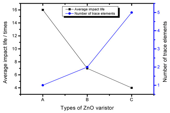 Similarly, by analyzing the microscopic characteristics and the impact life of the three ZnO varistors, it can be seen that the basic structural composition of different types of ZnO varistors is similar, which are composed of ZnO grains, grain boundary layers, spinel and pores. However, the added impurity components inside are different. The average impact life of the different types of ZnO varistors and the corresponding types of trace elements are shown in Figure 7. The horizontal axis is the type of ZnO varistor, the left vertical axis is the average impact life and the right vertical axis is the trace element type. The C type ZnO varistor has the most added trace elements, a total of five types—Bi, Sb, Zr, Co, Ni—an average impact life of 4 and the worst ability to withstand the impact. The type A ZnO varistor has the least added trace elements—only the Bi element—an average impact life of 16 and the best impact resistance. It can be seen that, without considering the influence of other factors, the increase in the trace element types in this study did not improve the average impact life of the ZnO varistors under the multi-pulse, and it may also reduce the average impact life.