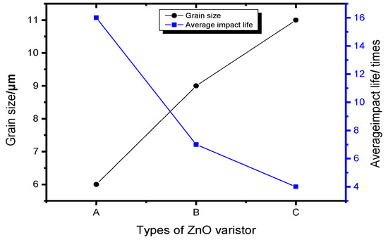 The average impact life of the ZnO varistor is also closely related to the microstructure parameters such as grain size. Only from the comprehensive analysis of multiple parameters can we reach a more scientific conclusion. The grain size of the ZnO varistor sample corresponding to the median life was statistically analyzed, as shown in Figure 8. It can be seen from the Figure that the number of the impact resistance of a ZnO varistor is inversely proportional to the grain size. The smaller the grain size, the larger the number of average impact life.