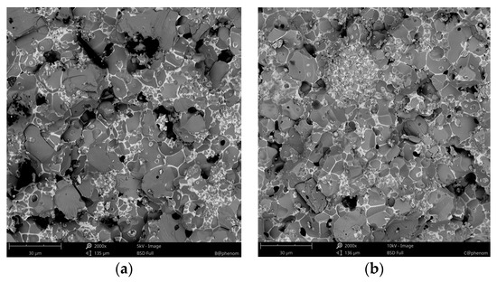 The five-pulse impact experiment of the sample was micro-analyzed. The SEM scanning image of the ZnO varistor before the impact is shown in Figure 9a, with a resolution of 30 µm. The SEM photos without aging before impact have regular cross-sections. The ZnO grains in the image are full with high density, more uniform distribution, larger particles and the average grain size is about 15–20 µm and the grain boundary with the grain is clearly distinguishable. The SEM scanning image of the ZnO varistor after the first impact is shown in Figure 9b. Compared with before the impact, the grain size after the first impact becomes smaller and the area of the white area increases. The difference in the microstructure of the ZnO material indicates that the multi-pulse lightning current will cause the ZnO grain structure to change after the first impact. It can be seen that the next impact of multiple pulses will affect the ZnO grain structure, which is obviously different from that under the single pulse. Under the single pulse, the structure of the grain boundary layer hardly changes after the first impact.