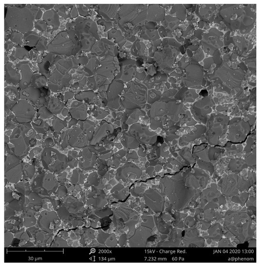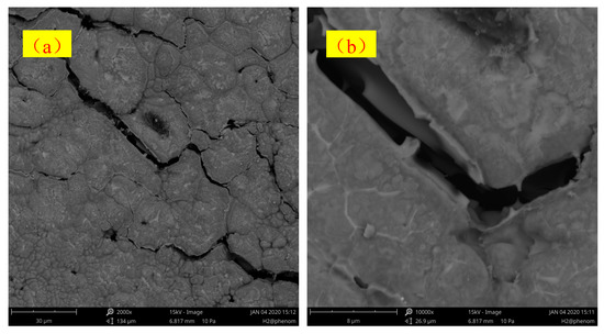 As the number of impacts increases, the current density in the low-resistance region will increase, resulting in a local temperature increase, which will cause the surface of the grain to melt through or merge between the grains and this thermal destruction process will be transmitted to the adjacent grain in the boundary–grain structure, resulting in a series of aging. The SEM image of the microstructure of the ZnO varistor in the later stages of impact is shown in Figure 11. It can be seen that the width of the crack gap continued to increase, the width capable of reaching about 2 µm, and the grain morphology changed, the contour of the grain edge being no longer clearly visible.