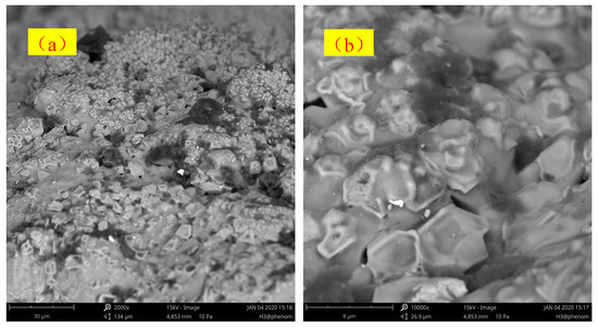 As the grain boundary is severely damaged, the performance of the ZnO varistor in the small- and medium-current region deteriorates. Under the microscope, the inner wall surface of the breakdown channel exhibits obvious melting characteristics. At the bottom of the breakdown channel, some molten craters produced by arc ablation can be seen. When impact damage leads to the serious failure of the ZnO material or even grain crushing, as shown in Figure 12a, the grains are completely crushed at this time, the entire grain boundary shows a molten state and the melting point of Bi2O3 in the grain boundary layer is generally 820 °C. It can be inferred that the temperature at the current breakdown channel of the ZnO varistor was quite high. Through the partial magnification observation, the image after 10,000 times magnification is shown in Figure 12b, and the state of the “cauliflower”-shaped crystal grains can be observed. This phenomenon has never been found in single pulse research.