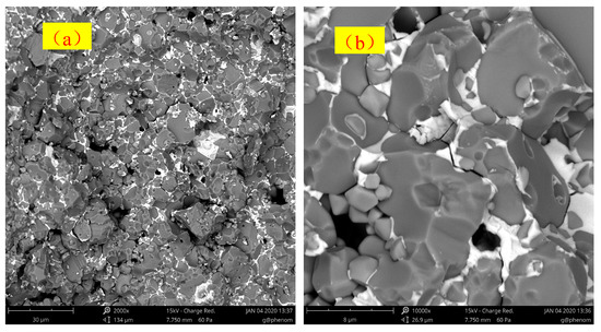 SEM image of the microstructure of the ZnO varistor damaged after the multi-pulse currents: (a) 2000 times magnification; and (b) 10,000 times magnification.