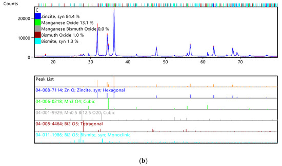 As shown in Figure 14a, the XRD diffraction pattern of the ZnO varistor before the impact shows that the crystal phase composition of the ZnO varistor mainly including five parts: the zinc oxide red zinc ore phase, MnO cubic crystal phase, manganese bismuth oxidation material cubic crystal phase, Bi2O3 cubic crystal phase and the Bi2O3 tetragonal crystal phase.