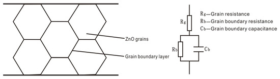 The microstructure of the ZnO varistor is composed of grains and discontinuous grain boundary layers surrounding the grains. The simplified microstructure and the equivalent circuit of the crystal unit are shown in Figure 15. The basic unit of the ZnO varistor is a hexagon. The volume represents an approximate polygon [17]. The simplified microstructure was mainly composed of ZnO grains and grain boundary layers. The equivalent circuit of the crystal unit was composed of grain resistance, grain boundary resistance and grain boundary capacitance. According to the theory of linear chain aging, the effect of capacitance can be ignored under the impact of a large current. The equivalent circuit can be regarded as a linear grain resistance Rg and a variable grain boundary resistance Rb connected in series. Rb is the part that produces the varistor effect. Multiple Rg and multiple Rb are connected in series to form a voltage-dependent chain. The ZnO varistor can be regarded as a network system consisting of n varistor chains connected in parallel in the conduction direction [18].