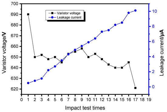 The varistor voltage and leakage current of the ZnO varistor were measured during multiple impacts and the trend of the average level of the varistor voltage and leakage current with the number of impacts was plotted, as shown in Figure 16. It can be seen from Figure 16 that the average number of impacts that the ZnO varistor can withstand is 16, and the variation laws of the varistor voltage and leakage current of ZnO varistor samples of different individuals tend to be consistent with the leakage current increasing. Whilst the increase rate is relatively fast, the average growth rate can reach 0.66 µA/time. The varistor voltage decreases with the increase in the number of impacts. The varistor voltage drops after the first impact, with an average decrease of up to 6%. The intermediate changes show fluctuations. After the 16th impact, the varistor voltage drops sharply, and the average amplitude of the drop exceeds 10% of the original varistor voltage, and the ZnO varistor fails. After another impact, the ZnO varistor was damaged. The varistor voltage is proportional to the sum of the grain boundary resistances. From this, it can be seen that as the number of impact tests increases, the total resistance gradually decreases.